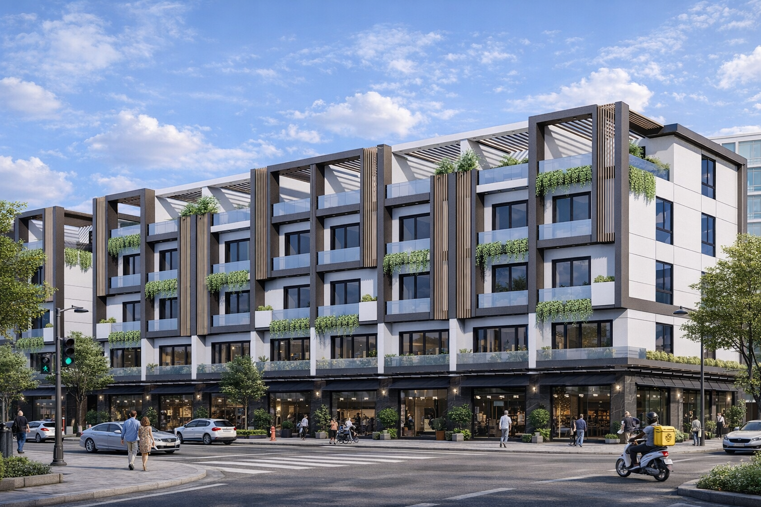 Điểm chạm đắt giá nhất chính là những "thác xanh" mềm mại rủ xuống từ ban công, khéo léo xóa nhòa ranh giới giữa bê tông và thiên nhiên, mang lại hơi thở tươi mát cho từng góc phố. Với tầng trệt sở hữu hệ kính lớn bóng bẩy, công trình không chỉ là một kiệt tác kiến trúc để chiêm ngưỡng mà còn là tâm điểm giao thương thịnh vượng, nơi kiến tạo nên những giá trị sống đẳng cấp và bền vững theo thời gian.