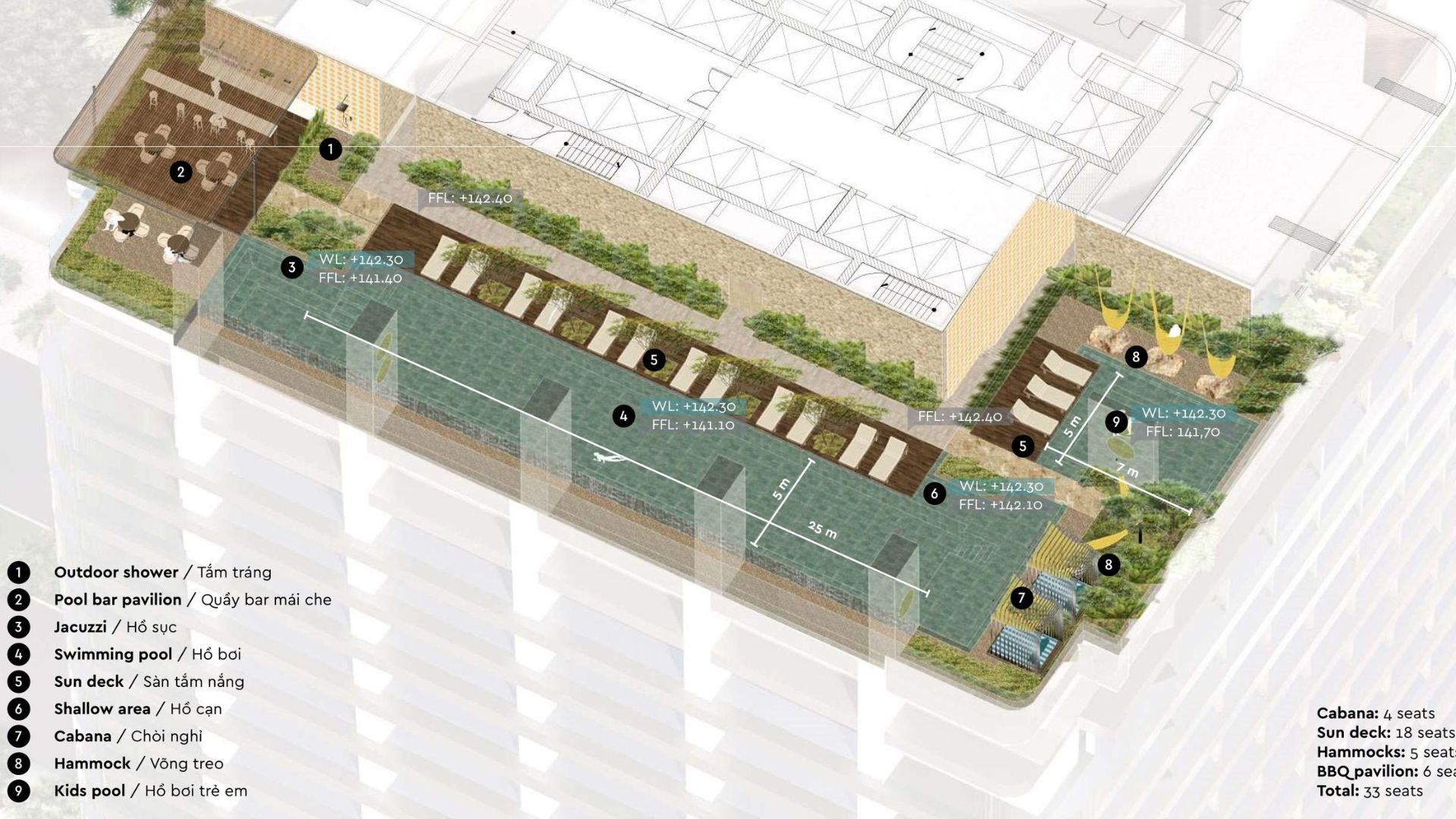 Dự án Khu nhà ở hỗn hợp cao cấp là sự kết hợp hoàn hảo giữa tiện ích cao cấp và không gian xanh thư giãn trên cao. Với điểm nhấn là hồ bơi vô cực hiện đại, khu vực được quy hoạch tinh tế bao gồm quầy bar mái che, sân tắm nắng, chòi nghỉ và khu vui chơi trẻ em. Sự đan xen giữa cây xanh nội khu và tầm nhìn khoáng đạt tạo nên một ốc đảo yên bình, mang đến trải nghiệm sống nghỉ dưỡng đẳng cấp ngay trong lòng khu căn hộ hỗn hợp cao cấp.