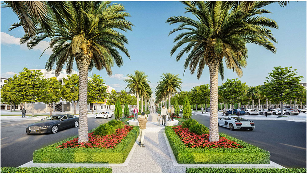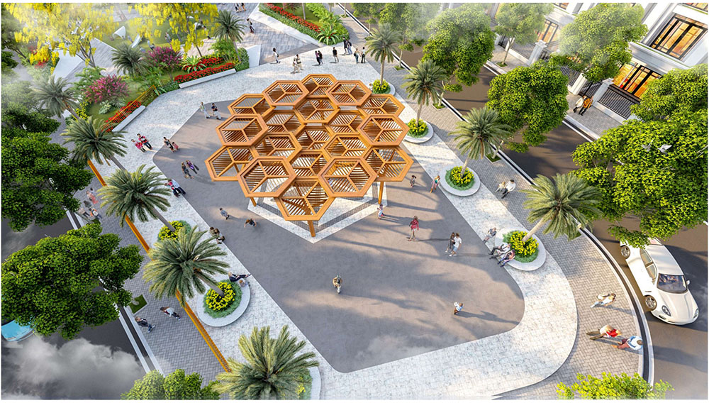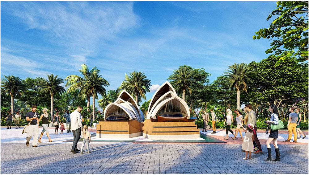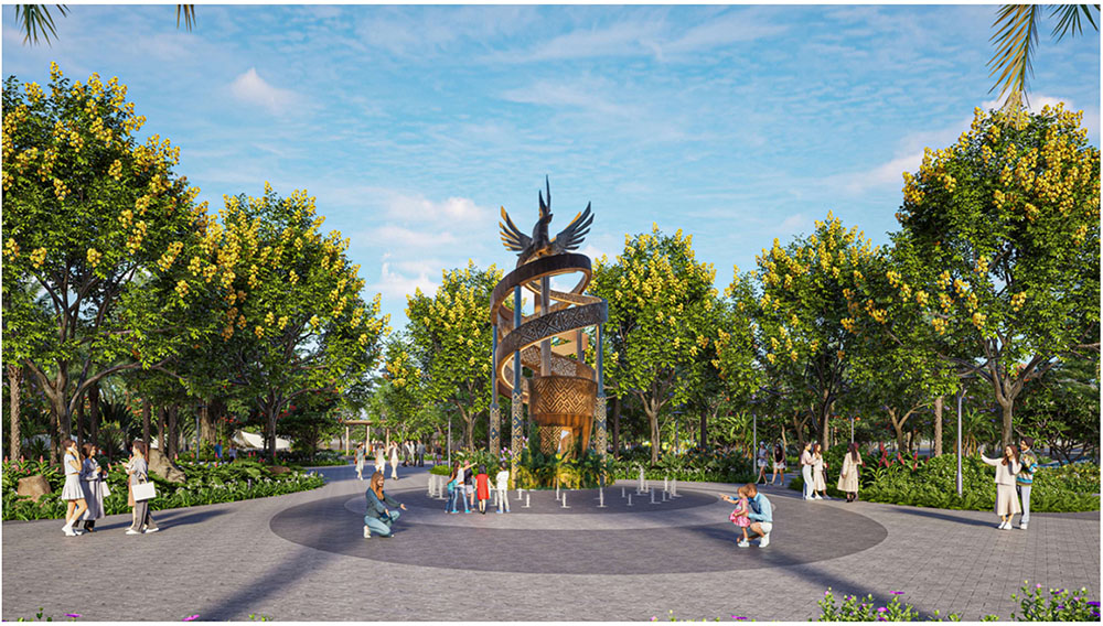 Điểm nhấn nổi bật của dự án nằm ở ý tưởng thiết kế cảnh quan lấy cảm hứng từ hình ảnh “thuyền nan” trên dòng nước, một biểu tượng quen thuộc của văn hóa sông nước miền Tây. Hình tượng chiếc thuyền nhỏ len lỏi trên mặt kênh, gắn liền với nhịp sống lao động và sinh hoạt của người dân, được chuyển hóa khéo léo vào bố cục không gian và các chi tiết nghệ thuật trong đô thị. Những đường nét mềm mại của thuyền và mái chèo được thể hiện trong thiết kế lối dạo bộ, quảng trường cảnh quan và các điểm nhấn nghệ thuật, tạo nên một “bức tranh làng chài giữa lòng đô thị”. Sự kết hợp giữa yếu tố văn hóa bản địa và ngôn ngữ thiết kế hiện đại không chỉ mang lại giá trị thẩm mỹ độc đáo mà còn góp phần định hình bản sắc riêng cho khu đô thị, biến nơi đây trở thành không gian sống mang đậm dấu ấn miền Tây nhưng vẫn đáp ứng tiêu chuẩn của một khu đô thị phát triển bền vững.