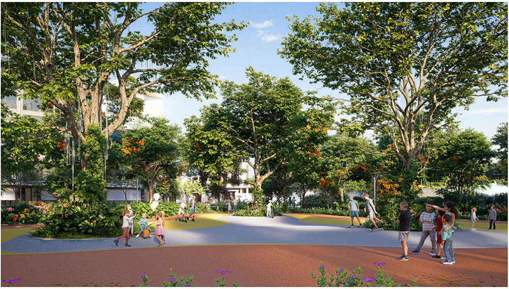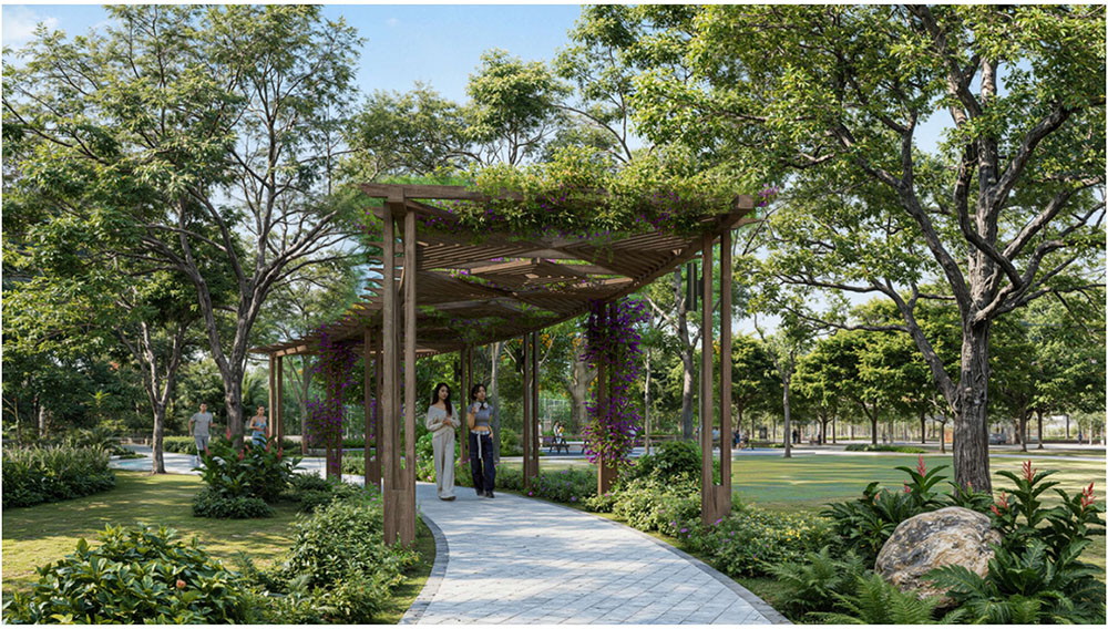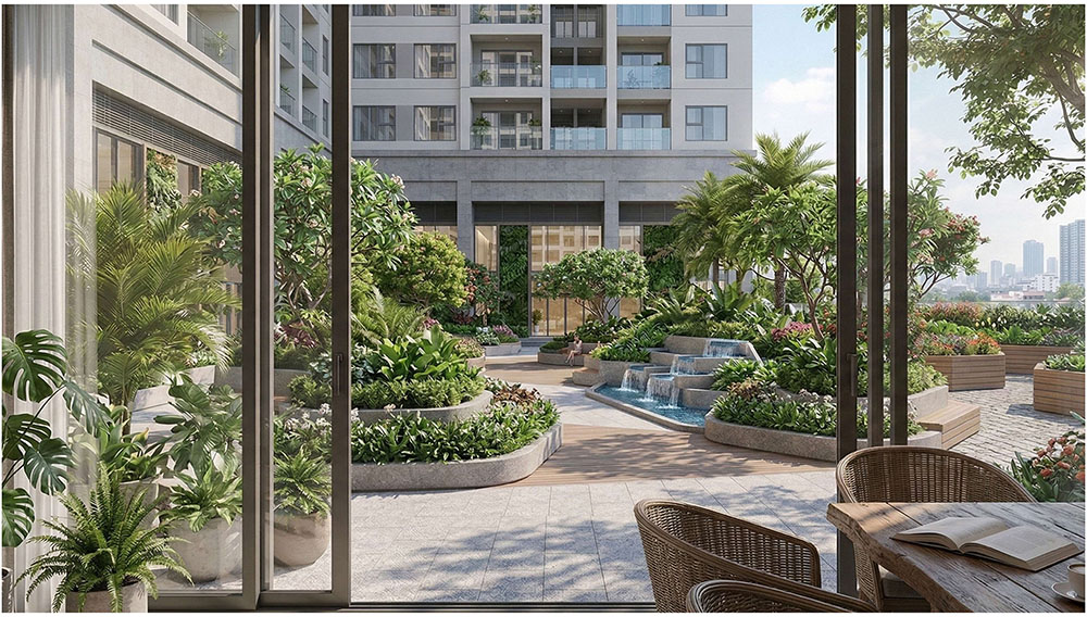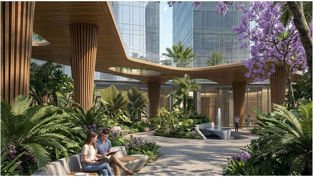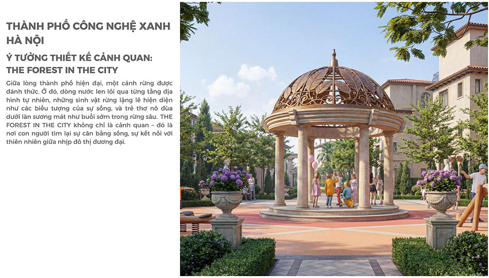 Ý tưởng cảnh quan của dự án được phát triển dựa trên triết lý “The Forest in the City – Khu rừng trong lòng đô thị”, tái hiện hình ảnh một hệ sinh thái tự nhiên được đánh thức giữa trung tâm thành phố. Các lớp địa hình, mảng xanh và hệ thống mặt nước được tổ chức theo dòng chảy tự nhiên, tạo nên cảm giác như một khu rừng đang len lỏi trong cấu trúc đô thị. Những tuyến đường dạo bộ, quảng trường xanh và không gian sinh hoạt cộng đồng được bố trí xen kẽ với thảm thực vật bản địa, mang lại trải nghiệm sống gần gũi với thiên nhiên cho cư dân. Không gian tại đây không chỉ là nơi để ở, mà còn là nơi con người có thể tìm lại sự cân bằng, tái tạo năng lượng và kết nối với thiên nhiên giữa nhịp sống đô thị ngày càng năng động của Hà Nội.