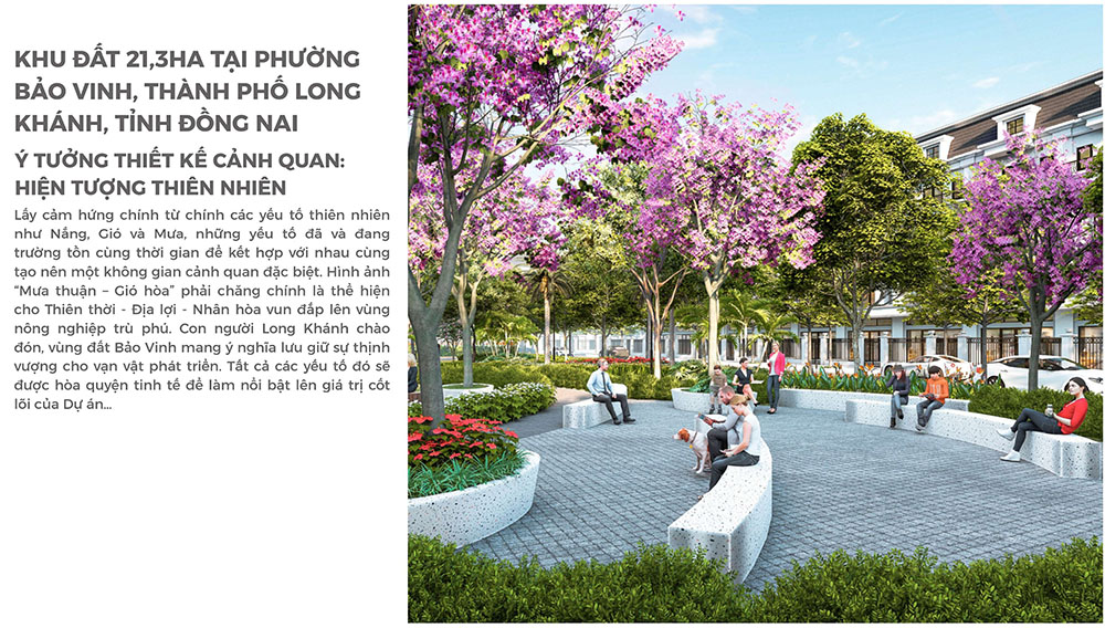 Ý tưởng thiết kế cảnh quan của dự án được xây dựng dựa trên cảm hứng từ các yếu tố tự nhiên đặc trưng như Nắng – Gió – Mưa, những yếu tố đã gắn bó với sự phát triển của vùng đất Long Khánh qua nhiều thế hệ. Từ triết lý này, không gian cảnh quan được tổ chức theo hướng mềm mại, chuyển tiếp tự nhiên giữa các khu chức năng, kết hợp hệ thống cây xanh, mặt nước và các tuyến dạo bộ nhằm tạo nên môi trường sống trong lành và giàu trải nghiệm. Hình ảnh “mưa thuận gió hòa” không chỉ là biểu tượng của sự hài hòa giữa thiên nhiên và con người mà còn thể hiện định hướng phát triển bền vững của dự án, nơi các giá trị Thiên thời – Địa lợi – Nhân hòa được kết hợp chặt chẽ trong từng giải pháp quy hoạch và thiết kế. Qua đó, khu đất Bảo Vinh được kỳ vọng sẽ trở thành một không gian đô thị mới mang dấu ấn riêng, góp phần nâng cao chất lượng môi trường sống và tạo động lực phát triển cho khu vực Long Khánh trong tương lai.