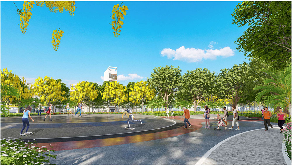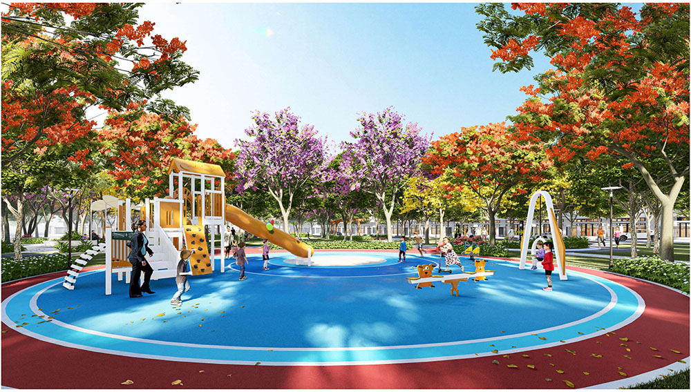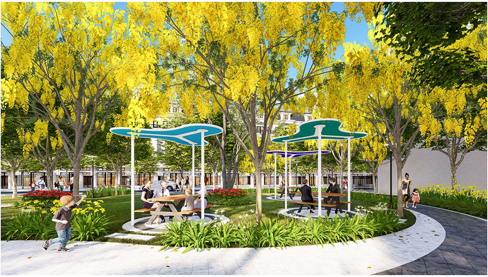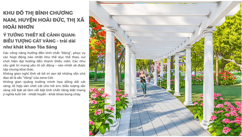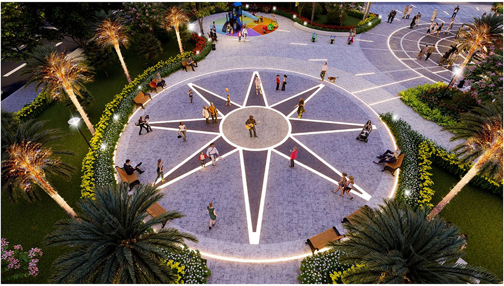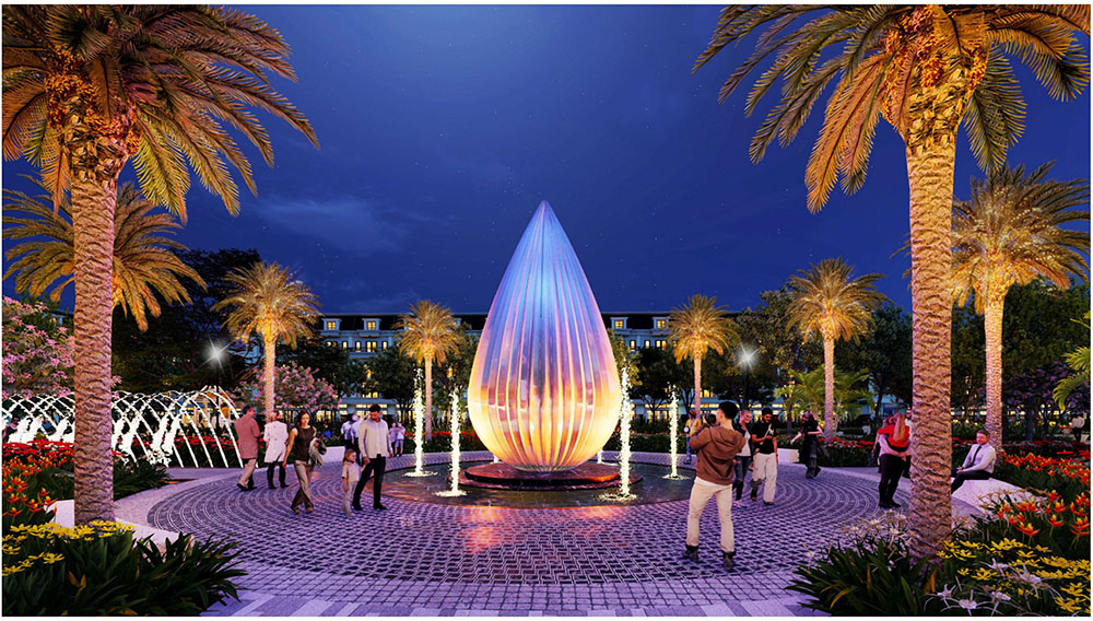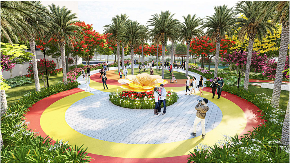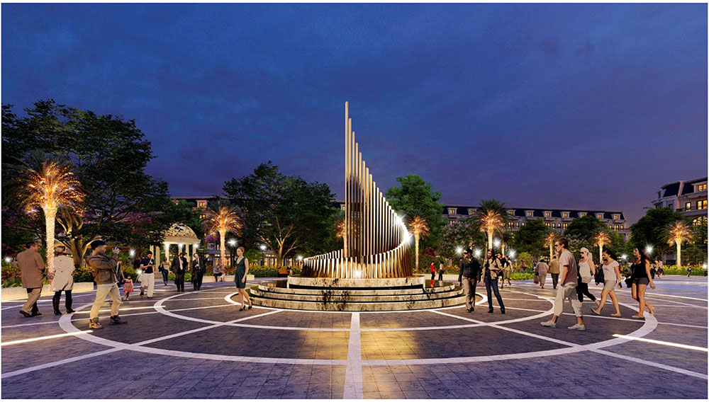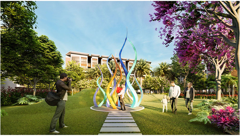 Điểm nhấn nổi bật của dự án nằm ở ý tưởng thiết kế cảnh quan lấy cảm hứng từ “biểu tượng cát vàng”, thể hiện tinh thần trẻ trung, năng động và khát vọng phát triển của đô thị mới. Các không gian sinh hoạt cộng đồng như quảng trường, khu thể thao, khu vui chơi trẻ em và các khu giải trí ngoài trời được tổ chức theo hướng mở, khuyến khích sự giao lưu và hoạt động sôi nổi của cư dân. Đặc biệt, quảng trường trung tâm được thiết kế mô phỏng hình thái dòng cát trải dài, kết hợp các khu sân chơi cát và điểm nhấn điêu khắc biểu tượng, tạo nên một không gian sinh động mang bản sắc riêng. Xen kẽ giữa các khu vực năng động là những khoảng xanh và không gian nghỉ tĩnh, giúp cân bằng trải nghiệm đô thị, mang lại môi trường sống tiện nghi, hiện đại nhưng vẫn gần gũi với thiên nhiên.