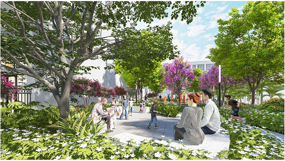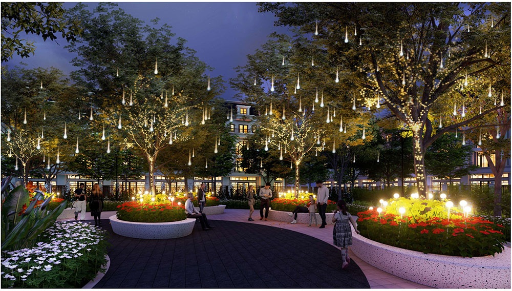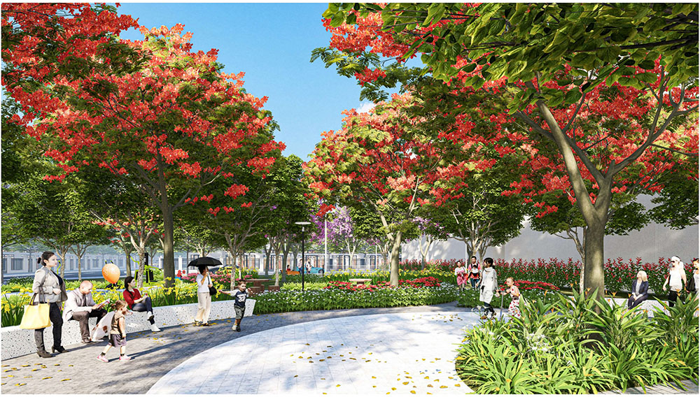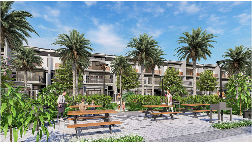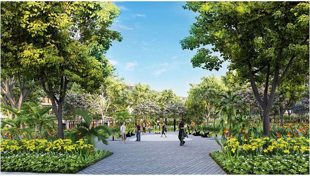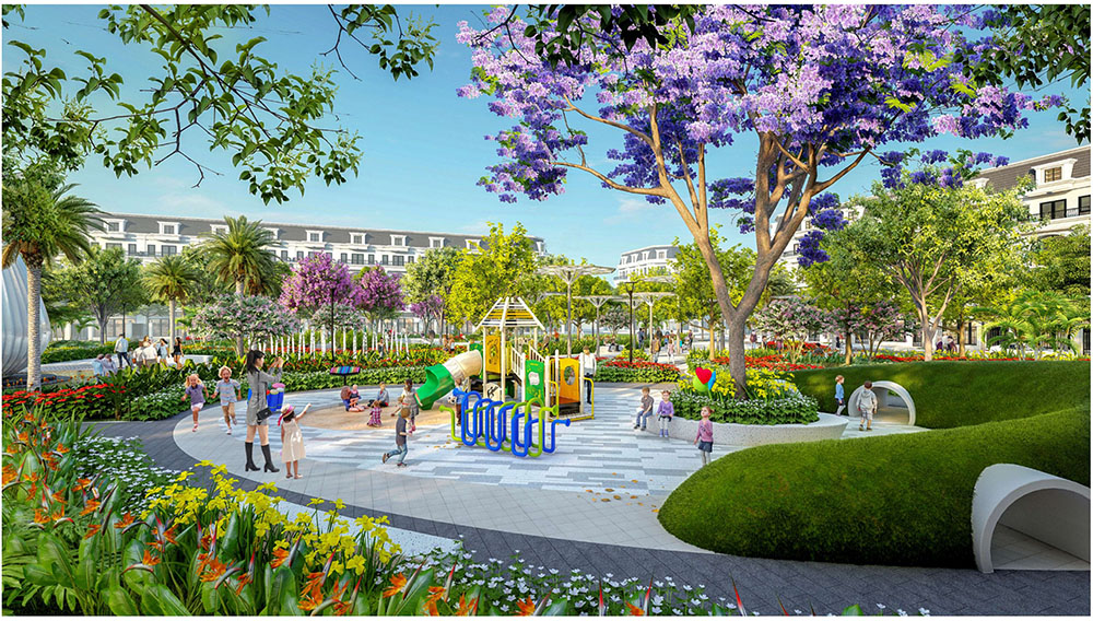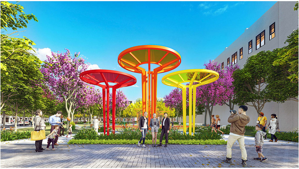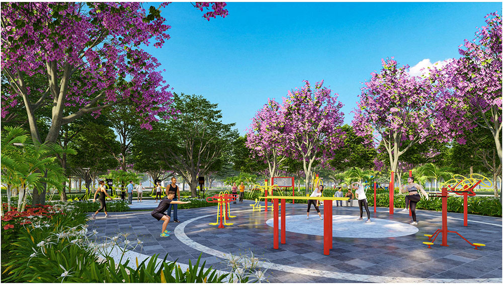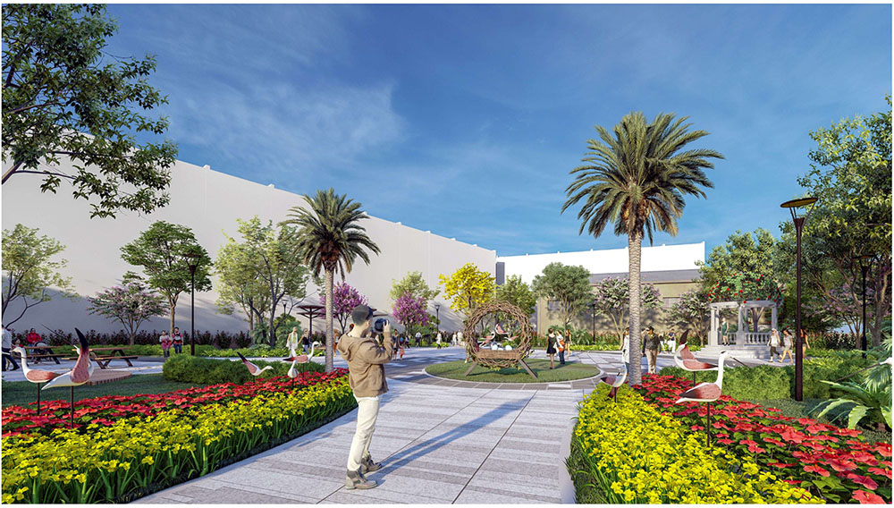 Điểm nhấn nổi bật của dự án nằm ở ý tưởng thiết kế cảnh quan lấy cảm hứng từ “biểu tượng cát vàng”, thể hiện tinh thần trẻ trung, năng động và khát vọng phát triển của đô thị mới. Các không gian sinh hoạt cộng đồng như quảng trường, khu thể thao, khu vui chơi trẻ em và các khu giải trí ngoài trời được tổ chức theo hướng mở, khuyến khích sự giao lưu và hoạt động sôi nổi của cư dân. Đặc biệt, quảng trường trung tâm được thiết kế mô phỏng hình thái dòng cát trải dài, kết hợp các khu sân chơi cát và điểm nhấn điêu khắc biểu tượng, tạo nên một không gian sinh động mang bản sắc riêng. Xen kẽ giữa các khu vực năng động là những khoảng xanh và không gian nghỉ tĩnh, giúp cân bằng trải nghiệm đô thị, mang lại môi trường sống tiện nghi, hiện đại nhưng vẫn gần gũi với thiên nhiên.