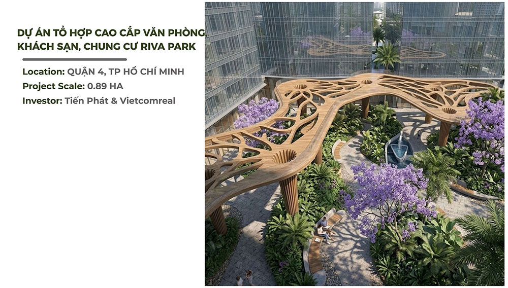 Dự án Tổ Hợp Cao Cấp Văn Phòng – Khách Sạn – Chung Cư Riva Park là công trình phát triển đô thị đa chức năng tọa lạc tại khu vực trung tâm Quận 4, TP. Hồ Chí Minh, với quy mô khoảng 0,89 ha và được đầu tư bởi liên danh Tiến Phát & Vietcomreal. Công trình được định hướng trở thành một tổ hợp hiện đại tích hợp nhiều chức năng gồm văn phòng làm việc, căn hộ cao cấp và khách sạn, đáp ứng nhu cầu sinh sống – làm việc – nghỉ dưỡng trong cùng một không gian đô thị khép kín. Trong bối cảnh mật độ xây dựng ngày càng cao của khu trung tâm thành phố, dự án tập trung vào giải pháp kiến trúc cảnh quan nhằm tạo ra môi trường sống thư giãn và cân bằng cho cư dân, đồng thời nâng cao giá trị thẩm mỹ tổng thể của khu đô thị. Thiết kế tổng thể chú trọng sự hài hòa giữa các khối công trình cao tầng với không gian xanh, mang đến trải nghiệm sống tiện nghi nhưng vẫn gần gũi với thiên nhiên.