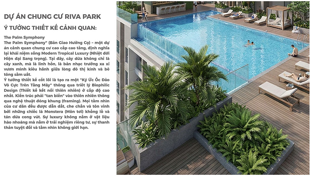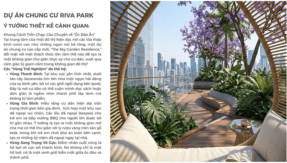 Điểm nổi bật của dự án nằm ở ý tưởng thiết kế cảnh quan lấy cảm hứng từ hình ảnh “ốc đảo an yên” giữa lòng đô thị sôi động. Hệ thống không gian trải nghiệm được tổ chức thành nhiều khu vực chức năng như khu thư giãn yên tĩnh dưới tán cây, khu sinh hoạt gia đình ngoài trời với các tiện ích BBQ và khu vui chơi trẻ em, cùng hồ bơi vô cực đóng vai trò điểm nhấn cảnh quan trung tâm. Những khu vực này không chỉ tạo ra môi trường sinh hoạt cộng đồng thân thiện mà còn giúp cư dân tận hưởng cảm giác nghỉ dưỡng ngay trong chính nơi ở của mình. Với định hướng thiết kế chú trọng trải nghiệm thực tế của người sử dụng, dự án Riva Park không đơn thuần là một khu căn hộ cao cấp mà còn là mô hình không gian sống hiện đại, nơi các yếu tố kiến trúc, cảnh quan và tiện ích được kết hợp hài hòa nhằm kiến tạo chất lượng sống bền vững cho cộng đồng cư dân đô thị.
