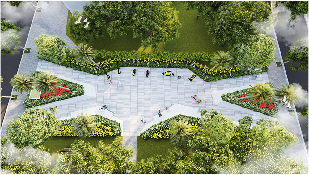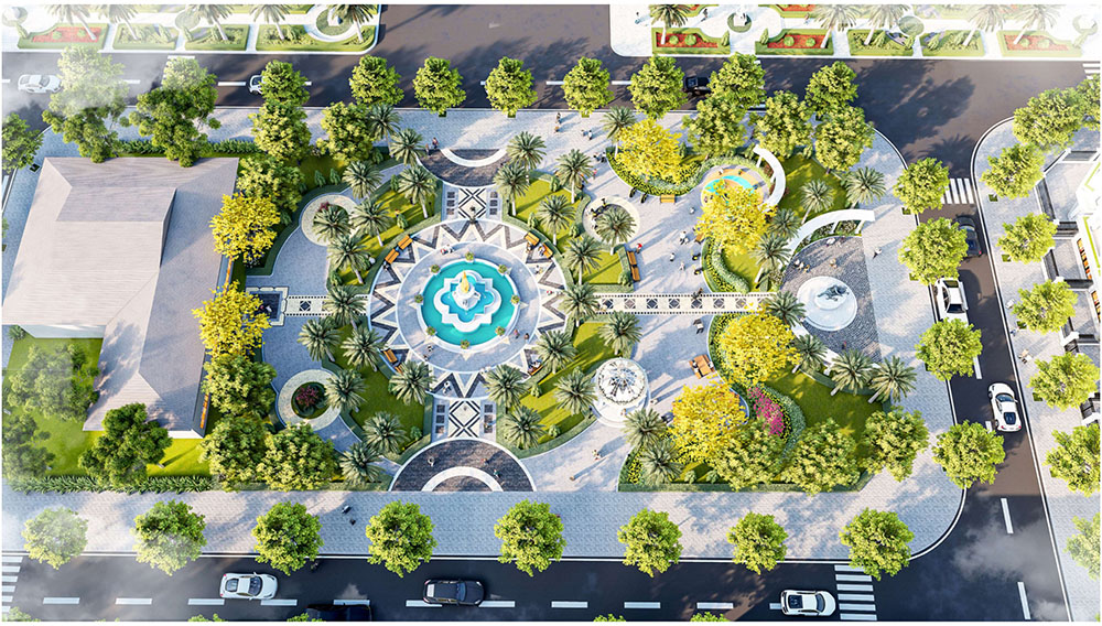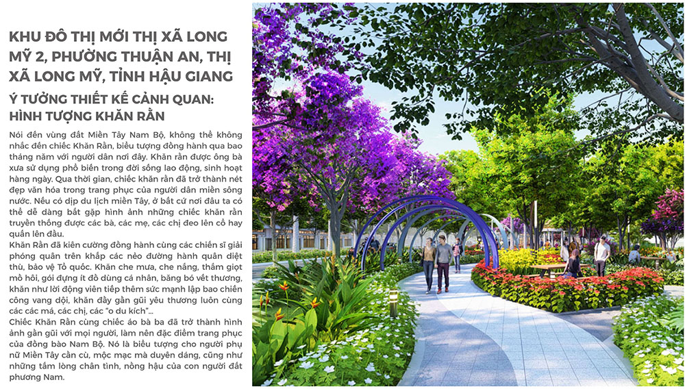 Điểm đặc sắc trong thiết kế cảnh quan của dự án chính là ý tưởng lấy hình tượng “khăn rằn Nam Bộ” làm cảm hứng chủ đạo. Hình ảnh chiếc khăn rằn – biểu tượng quen thuộc gắn liền với đời sống, lao động và văn hóa của người dân miền Tây – được chuyển hóa tinh tế vào các đường nét quy hoạch, tổ chức mảng xanh và không gian công cộng trong khu đô thị. Những dải cảnh quan mềm mại, các trục giao thông và khu sinh hoạt chung được bố trí hài hòa, tạo cảm giác gần gũi nhưng vẫn mang tính thẩm mỹ hiện đại. Qua quá trình nghiên cứu và phát triển ý tưởng, thiết kế không chỉ chú trọng yếu tố kiến trúc mà còn kể lại câu chuyện văn hóa địa phương, giúp dự án trở thành một không gian sống mang dấu ấn bản sắc vùng sông nước, đồng thời nâng cao giá trị cảnh quan và trải nghiệm sống cho cộng đồng cư dân tương lai.