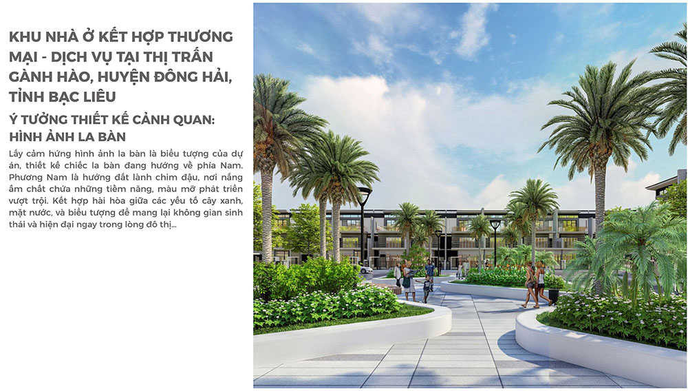 Ý tưởng thiết kế cảnh quan của dự án lấy cảm hứng từ hình ảnh la bàn – biểu tượng của định hướng và phát triển bền vững, đồng thời gợi nhắc đến đặc trưng của vùng đất ven biển nơi giao thương và khai thác thủy sản phát triển mạnh. Hình tượng la bàn được thể hiện xuyên suốt trong cấu trúc không gian cảnh quan, định hướng các trục giao thông và điểm nhấn công cộng, tạo nên bản sắc riêng cho toàn khu. Bên cạnh đó, các yếu tố cây xanh, mặt nước và không gian sinh thái được lồng ghép hài hòa trong quy hoạch nhằm mang lại môi trường sống thoáng đãng, thân thiện với thiên nhiên. Với định hướng kiến tạo một khu đô thị thương mại – dịch vụ hiện đại nhưng vẫn gắn kết với đặc trưng địa phương, dự án không chỉ góp phần hoàn thiện diện mạo đô thị thị trấn Gành Hào mà còn mở ra tiềm năng phát triển kinh tế – thương mại bền vững cho khu vực trong tương lai