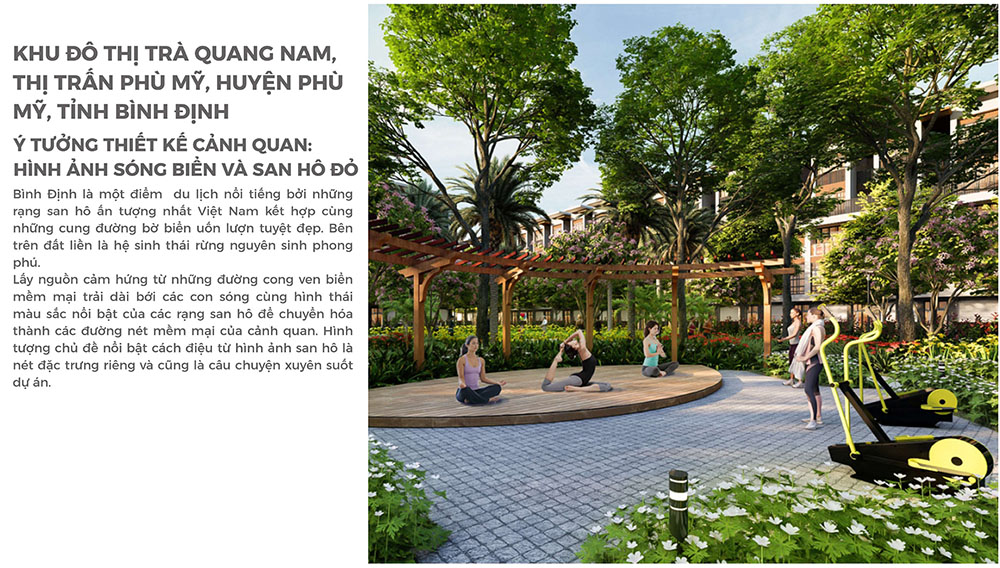 Ý tưởng thiết kế cảnh quan của dự án được lấy cảm hứng từ hình ảnh sóng biển và rạn san hô, tạo nên hệ ngôn ngữ thiết kế mềm mại, giàu tính tự nhiên và mang đậm dấu ấn vùng ven biển miền Trung. Các đường nét tổ chức không gian được phát triển theo hình thái uốn lượn linh hoạt, tái hiện sự chuyển động của dòng nước và cấu trúc sinh thái biển, từ đó hình thành nên các trục cảnh quan đặc trưng xuyên suốt toàn khu đô thị. Hệ thống cây xanh, mặt nước và không gian công cộng được bố trí đan xen, không chỉ góp phần nâng cao chất lượng môi trường sống mà còn tạo nên trải nghiệm cảnh quan đa dạng cho cư dân. Với cách tiếp cận thiết kế hiện đại nhưng vẫn tôn trọng bối cảnh địa phương, Khu Đô Thị Trà Quang Nam được kỳ vọng sẽ trở thành một điểm nhấn phát triển đô thị mới tại khu vực Phù Mỹ trong tương lai.