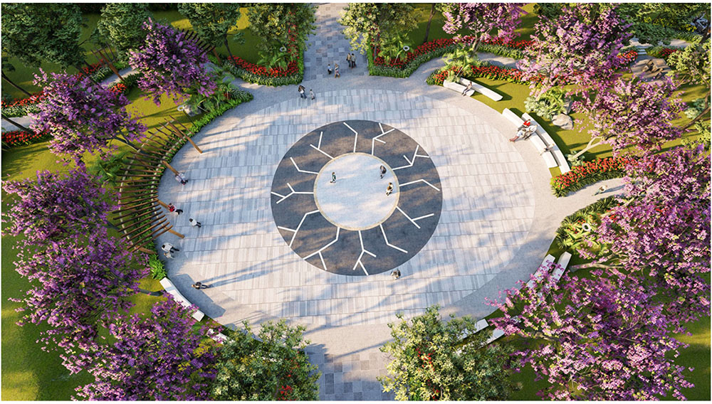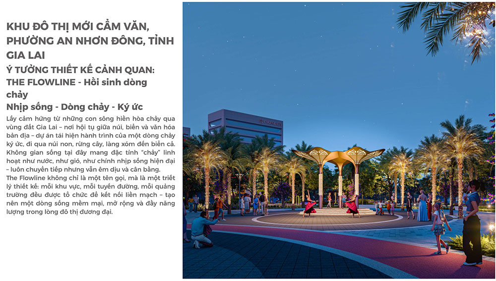 Ý tưởng thiết kế cảnh quan của dự án được phát triển theo triết lý “The Flowline – Hồi sinh dòng chảy”, lấy cảm hứng từ những dòng sông và nhịp chuyển động tự nhiên của vùng đất cao nguyên. Không gian đô thị được tổ chức theo các đường nét mềm mại, liên kết liên tục giữa các khu chức năng, tạo nên cảm giác chuyển động linh hoạt nhưng vẫn cân bằng và hài hòa. Các quảng trường, công viên và trục cảnh quan được bố trí như những “dòng chảy” xuyên suốt khu đô thị, góp phần tạo nên hệ sinh thái sống xanh, mở rộng không gian sinh hoạt cộng đồng và nâng cao trải nghiệm sống của cư dân. Thông qua cách tiếp cận này, Khu Đô Thị Mới Cầm Văn không chỉ tái hiện vẻ đẹp thiên nhiên đặc trưng của Gia Lai mà còn kiến tạo một môi trường sống hiện đại, nơi con người, kiến trúc và cảnh quan cùng hòa quyện trong một nhịp sống đô thị bền vững.