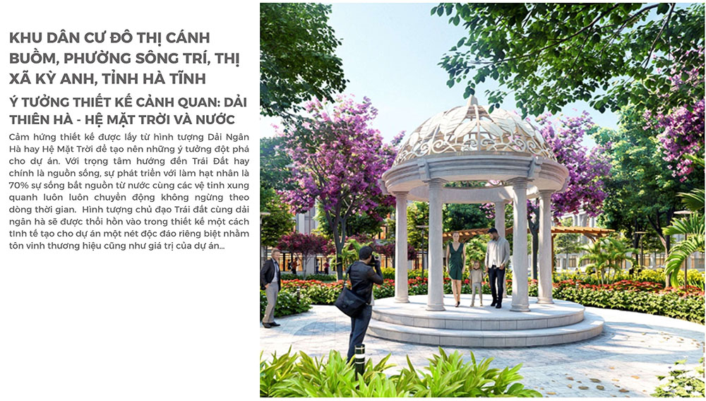 Điểm nổi bật của dự án nằm ở ý tưởng thiết kế cảnh quan lấy cảm hứng từ dải ngân hà và hệ mặt trời, trong đó nước và không gian xanh đóng vai trò hạt nhân của toàn bộ cấu trúc cảnh quan. Các trục cảnh quan chính được định hình như những “quỹ đạo” chuyển động liên tục, kết nối các khu chức năng trong toàn khu đô thị, tạo nên nhịp điệu không gian sống sinh động và giàu tính biểu tượng. Hệ thống hồ cảnh quan, lối dạo bộ, công viên và các điểm sinh hoạt cộng đồng được bố trí đan xen, vừa mang lại giá trị thẩm mỹ cao vừa góp phần cải thiện vi khí hậu cho toàn khu vực. Thông qua cách tiếp cận thiết kế này, Khu Dân Cư Đô Thị Cánh Buồm không chỉ đáp ứng nhu cầu an cư chất lượng mà còn trở thành điểm nhấn kiến trúc – cảnh quan mới, góp phần nâng tầm diện mạo đô thị tại thị xã Kỳ Anh trong tương lai.