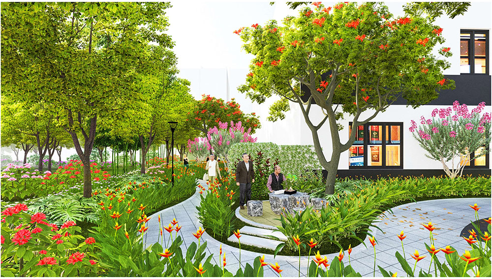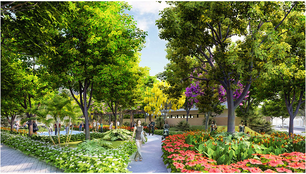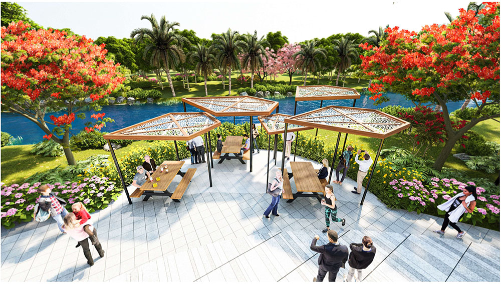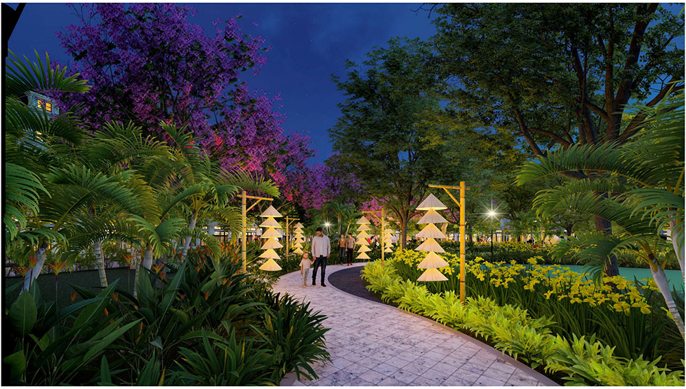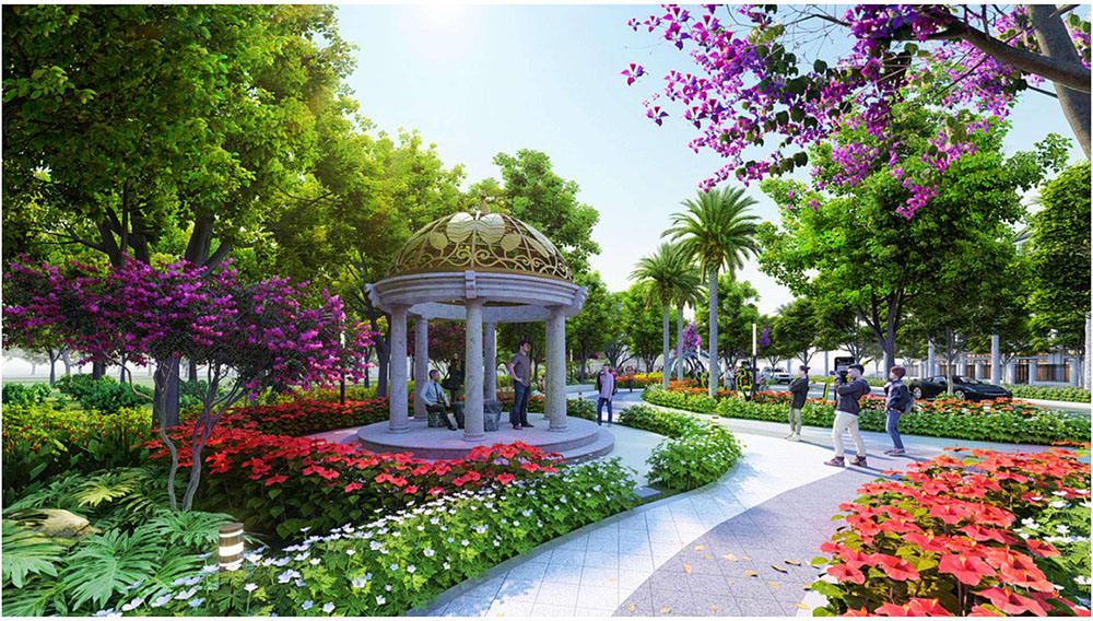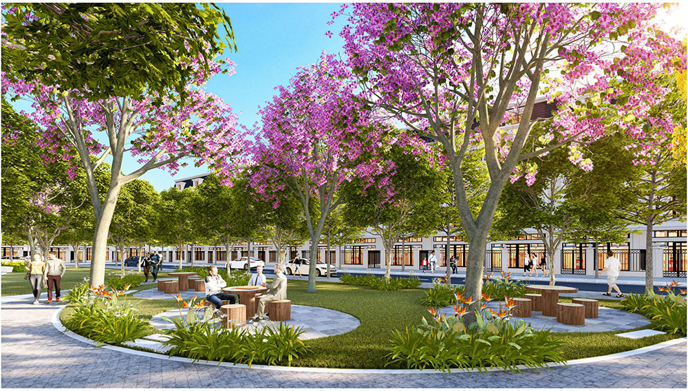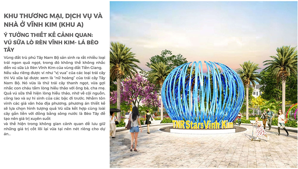 Điểm nổi bật trong ý tưởng thiết kế cảnh quan của dự án là việc lấy hình tượng trái vú sữa Lò Rèn Vĩnh Kim – đặc sản nổi tiếng của Tiền Giang – làm nguồn cảm hứng chủ đạo, kết hợp cùng hình ảnh bèo tây đặc trưng của vùng sông nước Tây Nam Bộ để tạo nên bản sắc riêng cho tổng thể không gian. Các chi tiết cảnh quan, tuyến đường nội bộ, mảng xanh và khu sinh hoạt cộng đồng được bố trí theo ngôn ngữ thiết kế mềm mại, gợi nhắc đến sự trù phú của vùng đất miệt vườn. Cách tiếp cận này không chỉ giúp dự án tôn vinh giá trị văn hóa bản địa mà còn mang lại trải nghiệm sống gần gũi thiên nhiên, góp phần tạo nên một khu đô thị vừa hiện đại, vừa lưu giữ được nét đặc trưng của vùng đất Vĩnh Kim.