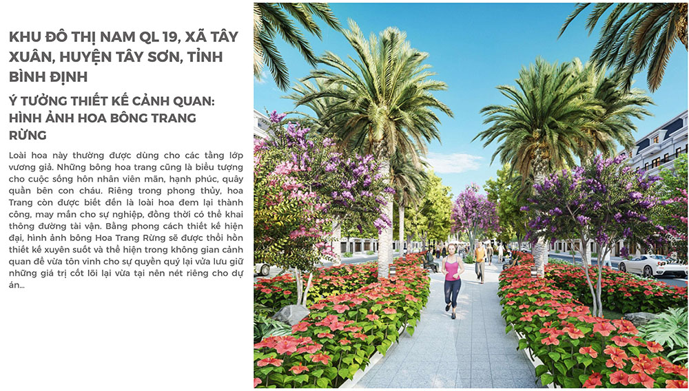 Ý tưởng thiết kế cảnh quan của dự án được lấy cảm hứng từ hình ảnh hoa Trang rừng, một biểu tượng mang nhiều ý nghĩa trong văn hóa Á Đông. Hình tượng này được lồng ghép xuyên suốt trong tổ chức không gian cảnh quan, từ các trục cảnh quan chính, quảng trường đến các tiểu cảnh và khu vườn nội khu, tạo nên dấu ấn thẩm mỹ riêng cho toàn bộ khu đô thị. Bên cạnh giá trị biểu tượng về sự may mắn, hạnh phúc và thịnh vượng, hình ảnh hoa Trang còn giúp hình thành ngôn ngữ thiết kế đặc trưng, góp phần nâng tầm bản sắc cho dự án. Với định hướng thiết kế hiện đại nhưng vẫn tôn trọng yếu tố phong thủy và văn hóa bản địa, Khu Đô Thị Nam QL19 không chỉ là một khu dân cư mới mà còn là không gian sống chất lượng, nơi hội tụ các giá trị về tiện nghi, cảnh quan và sự bền vững trong phát triển đô thị.