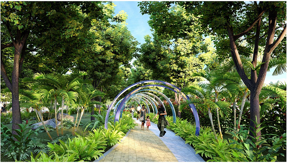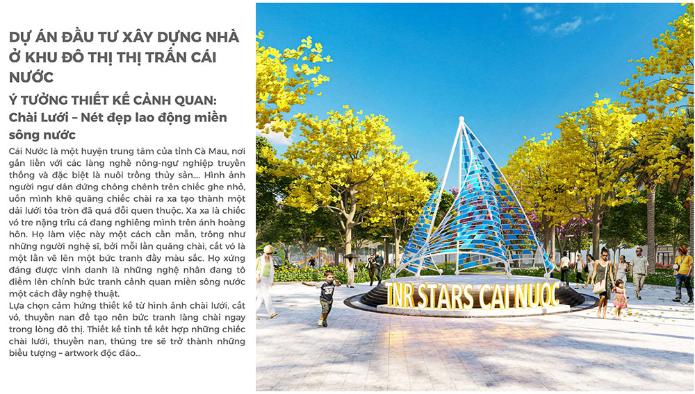 Điểm nhấn nổi bật của dự án nằm ở ý tưởng thiết kế cảnh quan mang chủ đề “Chài Lưới – Nét Đẹp Lao Động Miền Sông Nước”, lấy cảm hứng từ hình ảnh ngư dân và hoạt động đánh bắt thủy sản đặc trưng của vùng Cà Mau. Trung tâm cảnh quan được tổ chức với các công trình biểu tượng mang hình dáng lưới và thuyền cách điệu, kết hợp hệ thống quảng trường, đường dạo bộ và công viên cây xanh, tạo nên không gian sinh hoạt cộng đồng sinh động và gần gũi. Bên cạnh đó, dự án còn chú trọng phát triển các khu công viên ven mặt nước, tuyến đường đi bộ dưới tán cây và khu vui chơi ngoài trời cho trẻ em, góp phần hình thành một hệ sinh thái đô thị xanh – nơi cư dân có thể tận hưởng nhịp sống thư thái, hòa mình vào thiên nhiên nhưng vẫn đảm bảo đầy đủ tiện ích của một khu đô thị hiện đại.