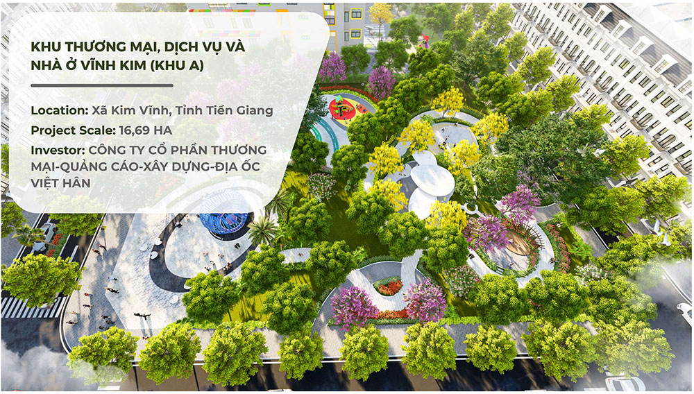 Khu Thương Mại, Dịch Vụ Và Nhà Ở Vĩnh Kim (Khu A) là dự án quy hoạch đô thị kết hợp thương mại – dịch vụ hiện đại tọa lạc tại xã Vĩnh Kim, tỉnh Tiền Giang, với quy mô khoảng 16,69 ha. Dự án được định hướng phát triển trở thành một không gian sống năng động, hài hòa giữa hoạt động thương mại và khu dân cư chất lượng cao, góp phần nâng tầm diện mạo đô thị khu vực. Với lợi thế vị trí nằm trong vùng kinh tế nông nghiệp trù phú của đồng bằng sông Tiền, phương án thiết kế chú trọng tổ chức không gian mở, kết hợp hệ thống giao thông nội khu hợp lý, các khu chức năng được phân bố khoa học nhằm tối ưu khả năng khai thác thương mại và đảm bảo môi trường sống tiện nghi cho cư dân.