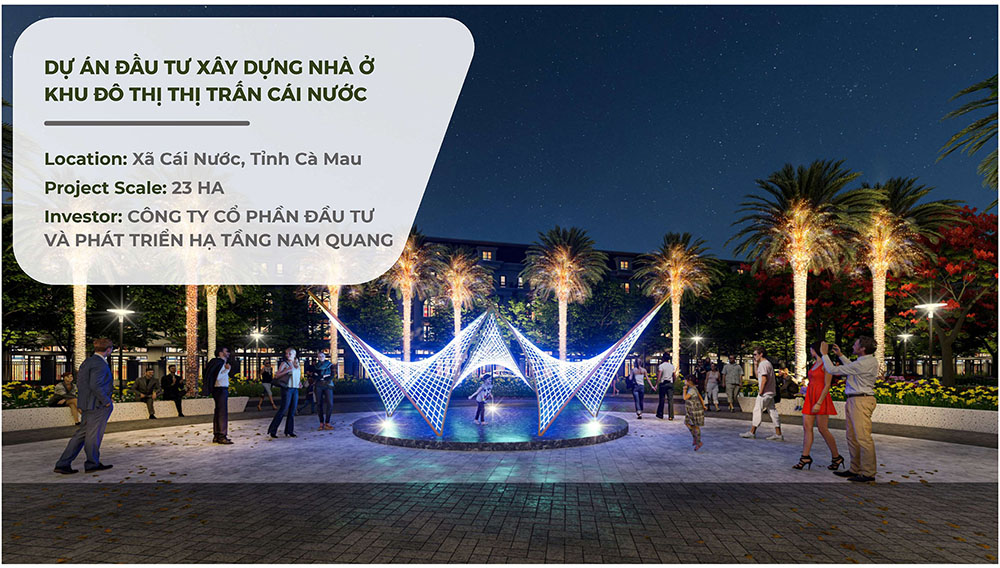 Dự án Đầu Tư Xây Dựng Nhà Ở Khu Đô Thị Thị Trấn Cái Nước được triển khai tại xã Cái Nước, tỉnh Cà Mau với quy mô quy hoạch khoảng 23 ha, hướng đến phát triển một khu đô thị hiện đại, đồng bộ hạ tầng và gắn kết chặt chẽ với đặc trưng sinh thái địa phương. Với định hướng trở thành khu dân cư kiểu mẫu của khu vực, dự án được đầu tư bởi Công ty Cổ phần Đầu tư và Phát triển Hạ tầng Nam Quang, tập trung xây dựng hệ thống không gian sống chất lượng, kết hợp giữa kiến trúc đô thị hiện đại và cảnh quan thiên nhiên đặc trưng vùng sông nước miền Tây. Từ tổng thể quy hoạch đến từng chi tiết thiết kế, dự án ưu tiên sự hài hòa giữa công năng sử dụng, tính thẩm mỹ và khả năng phát triển bền vững, tạo nên môi trường sống tiện nghi, an toàn và giàu bản sắc địa phương cho cộng đồng cư dân tương lai.