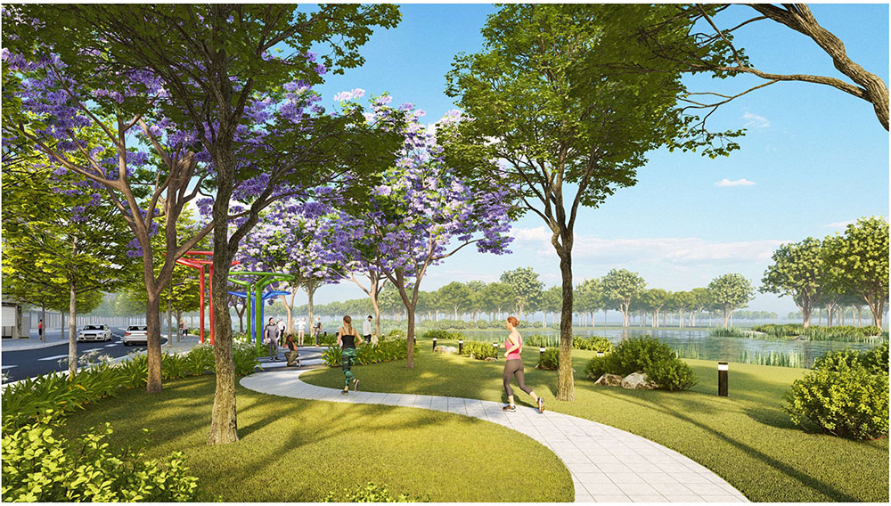 Trong quá trình nghiên cứu và phát triển ý tưởng, đội ngũ thiết kế chú trọng xây dựng câu chuyện cảnh quan gắn liền với hình ảnh hạt gạo – bông lúa, như một yếu tố nhận diện văn hóa địa phương. Các tuyến đường nội khu, công viên và không gian sinh hoạt cộng đồng được bố trí linh hoạt, tạo nên sự kết nối tự nhiên giữa các khu chức năng và khuyến khích các hoạt động giao lưu cộng đồng. Bên cạnh yếu tố thẩm mỹ, giải pháp thiết kế còn ưu tiên tính bền vững thông qua việc tăng mật độ cây xanh, tối ưu thông gió tự nhiên và tổ chức hệ thống mặt nước cảnh quan nhằm cải thiện vi khí hậu. Nhờ đó, Khu Đô Thị Mới Thị Trấn Phước Long không chỉ là một dự án phát triển hạ tầng đô thị mà còn hướng đến hình thành một môi trường sống chất lượng, hài hòa giữa giá trị truyền thống địa phương và phong cách đô thị hiện đại.