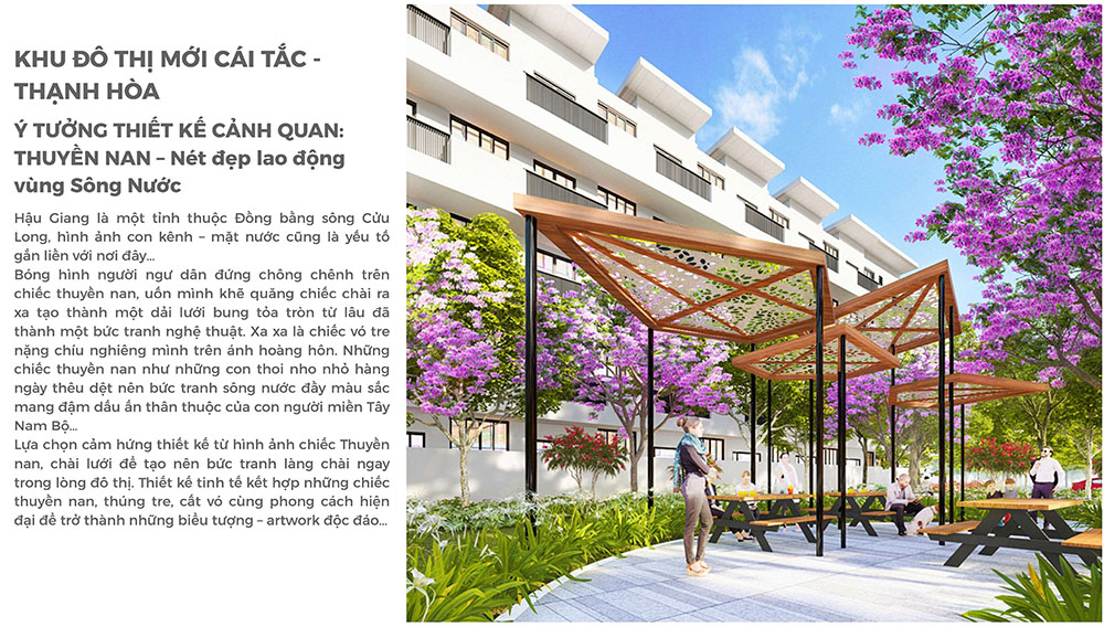 Khu Đô Thị Mới Cái Tắc – Thạnh Hòa được quy hoạch tại xã Thạnh Hòa, tỉnh Hậu Giang với quy mô khoảng 15,6 ha, hướng đến hình thành một khu đô thị hiện đại nhưng vẫn gìn giữ bản sắc đặc trưng của vùng sông nước Tây Nam Bộ. Trong quá trình nghiên cứu và triển khai ý tưởng, đội ngũ thiết kế đã khai thác sâu giá trị cảnh quan bản địa – nơi hình ảnh kênh rạch, dòng nước và đời sống lao động của người dân miền Tây luôn hiện diện như một phần không thể tách rời của không gian sống. Dự án được định hướng phát triển đồng bộ về hạ tầng, cảnh quan và tiện ích, tạo nên môi trường sống hài hòa giữa đô thị mới và thiên nhiên, đồng thời mang đến trải nghiệm sinh hoạt gần gũi, thoáng đãng cho cư dân tương lai.