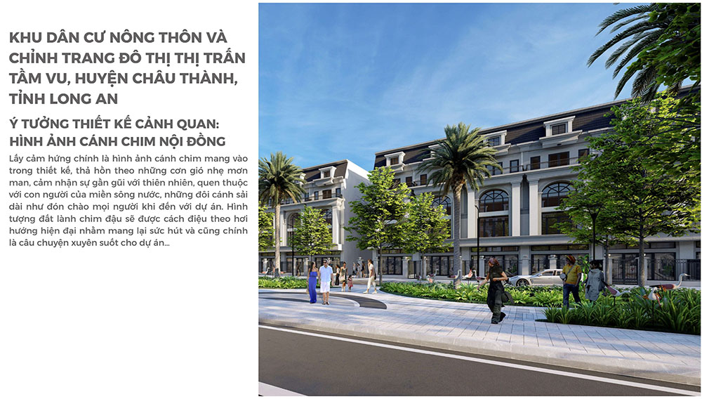 Ý tưởng thiết kế cảnh quan của dự án được lấy cảm hứng từ hình ảnh cánh chim bay trên những cánh đồng rộng lớn, biểu tượng quen thuộc của vùng sông nước miền Tây. Hình tượng này được chuyển hóa thành ngôn ngữ thiết kế hiện đại trong tổ chức không gian, các trục cảnh quan và khu vực sinh hoạt công cộng, tạo nên điểm nhấn nhận diện riêng cho toàn khu dân cư. Những đường nét mềm mại, mở rộng theo hướng gió và dòng chảy tự nhiên giúp mang lại cảm giác gần gũi với thiên nhiên, đồng thời tạo trải nghiệm không gian sống thoáng đãng cho cư dân. Thông qua việc kết hợp hài hòa giữa quy hoạch đô thị, kiến trúc cảnh quan và yếu tố bản địa, dự án hướng đến hình thành một khu dân cư chất lượng, góp phần nâng tầm diện mạo đô thị thị trấn Tầm Vu trong tương lai.