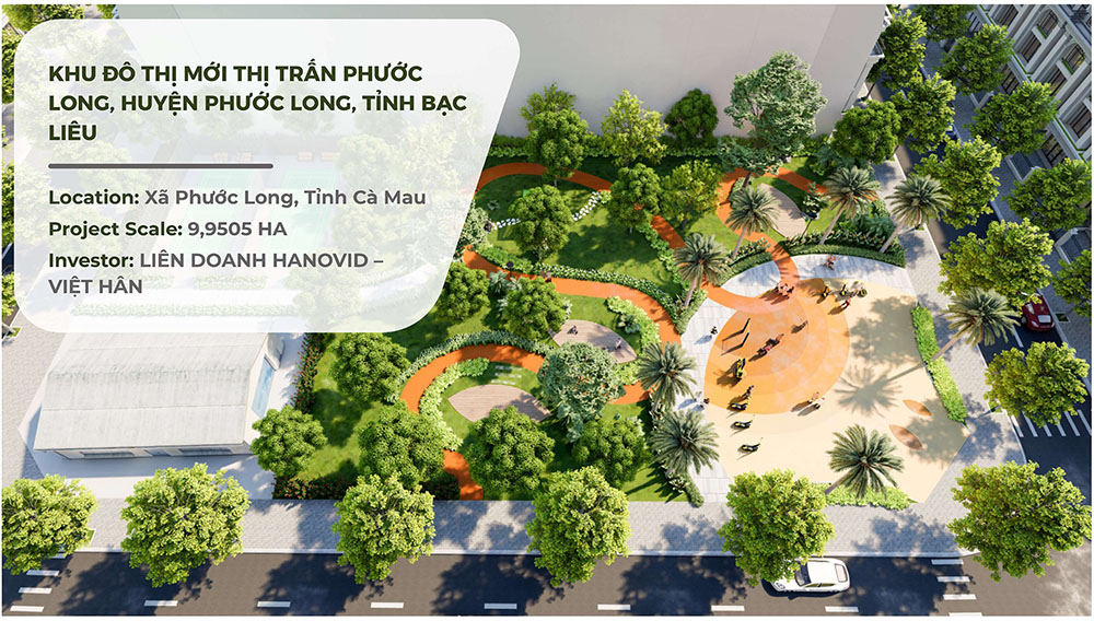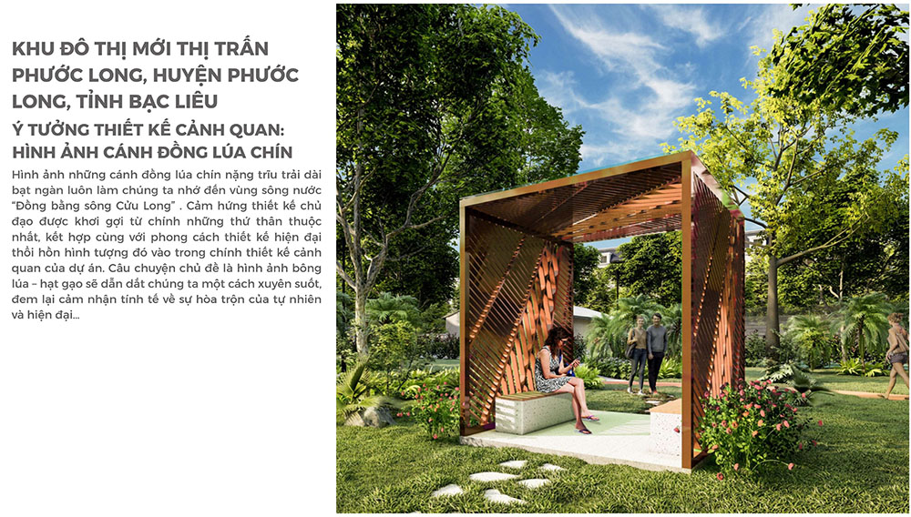 Khu Đô Thị Mới Thị Trấn Phước Long được định hướng phát triển như một không gian đô thị hiện đại nhưng vẫn giữ trọn bản sắc sinh thái đặc trưng của vùng Đồng bằng sông Cửu Long. Với quy mô khoảng 9,95 ha, dự án được quy hoạch đồng bộ từ hệ thống hạ tầng giao thông nội khu, không gian công cộng đến các khu chức năng ở, thương mại và cảnh quan xanh. Điểm nhấn trong định hướng thiết kế là ý tưởng khai thác hình ảnh cánh đồng lúa chín vàng, biểu tượng quen thuộc của vùng đất Nam Bộ, từ đó chuyển hóa thành ngôn ngữ kiến trúc và cảnh quan xuyên suốt toàn khu đô thị. Các trục cảnh quan, quảng trường và mảng xanh được tổ chức hài hòa nhằm tạo nên môi trường sống thoáng đãng, gần gũi thiên nhiên nhưng vẫn đáp ứng tiêu chuẩn tiện nghi của một khu đô thị mới.