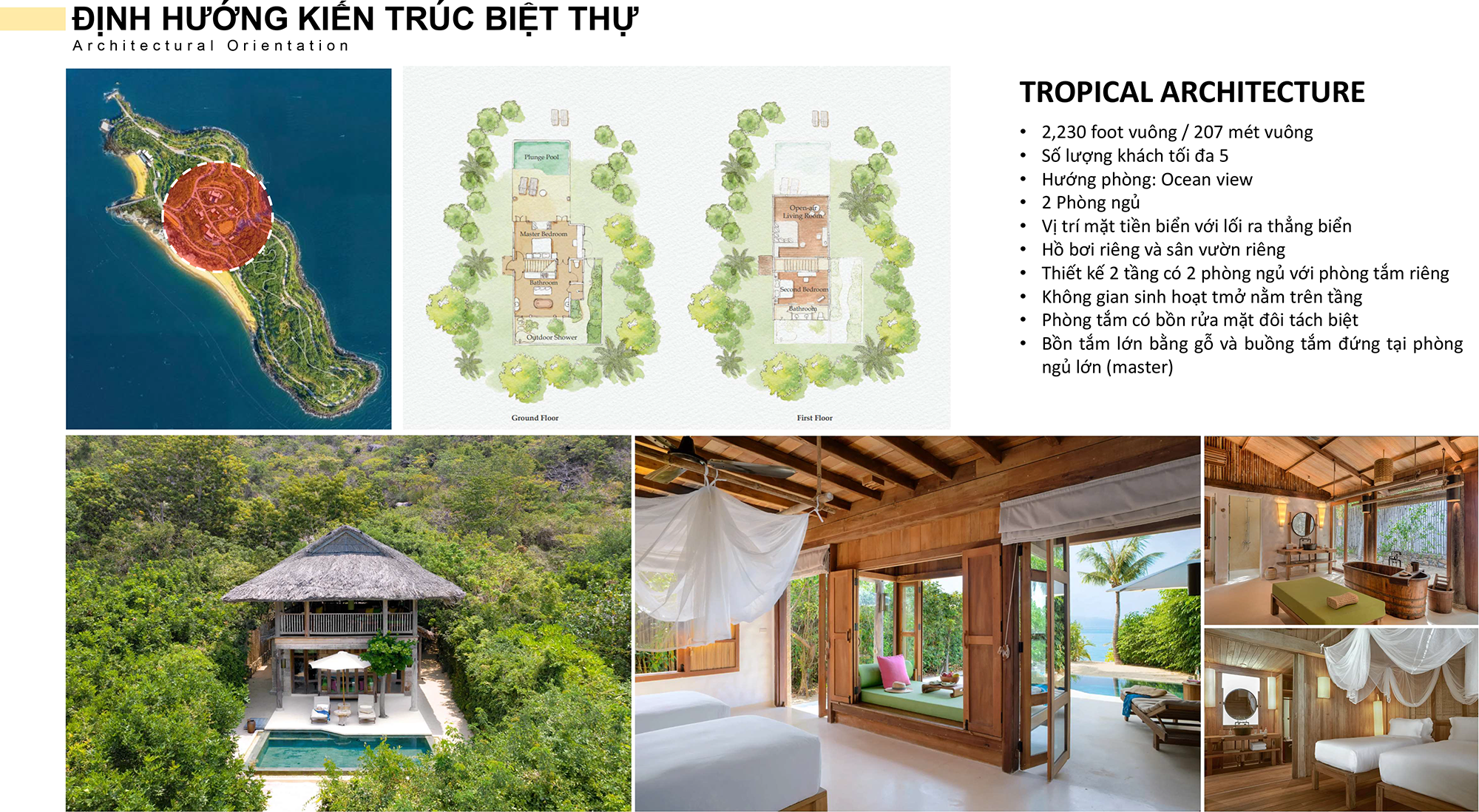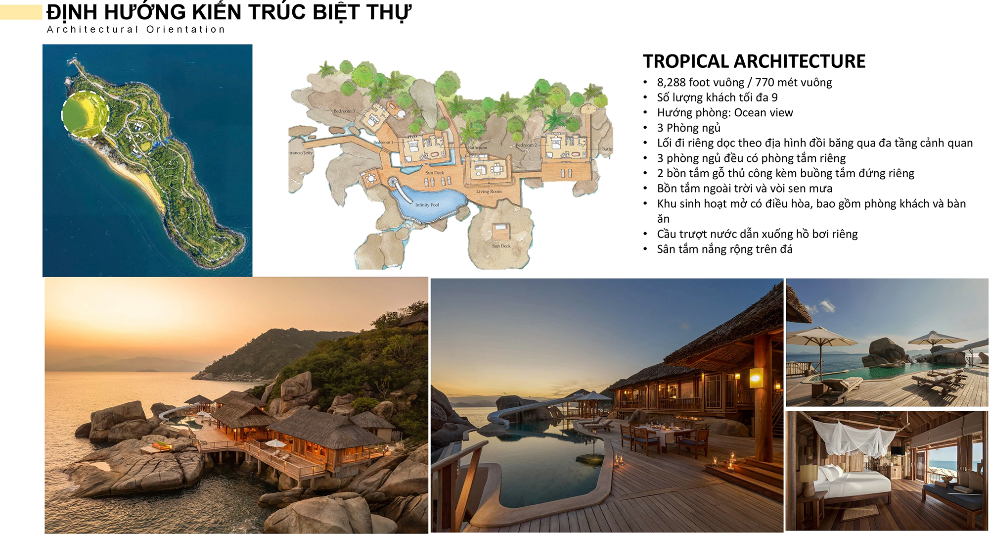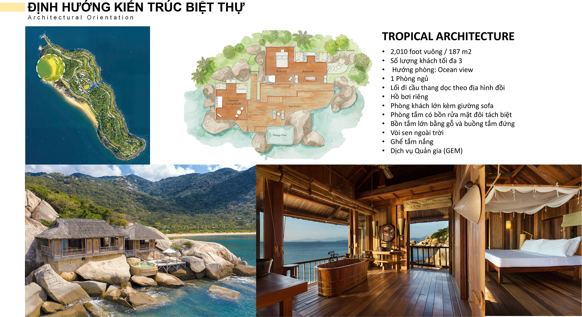 Các bungalow và villa nghỉ dưỡng được bố trí giãn cách, nép mình theo triền dốc tự nhiên, tận dụng gió biển và ánh sáng trời thay vì can thiệp mạnh vào địa hình. Vật liệu ưu tiên gỗ, đá tự nhiên, mái lá hoặc vật liệu thân thiện môi trường nhằm giảm tác động sinh thái và tạo cảm giác mộc mạc, gần gũi. Mỗi căn đều có hiên rộng, khoảng sân mở hoặc không gian ngồi ngoài trời – nơi du khách có thể đọc sách, uống trà, nghe tiếng sóng và cảm nhận nhịp sống chậm rãi của biển đảo.