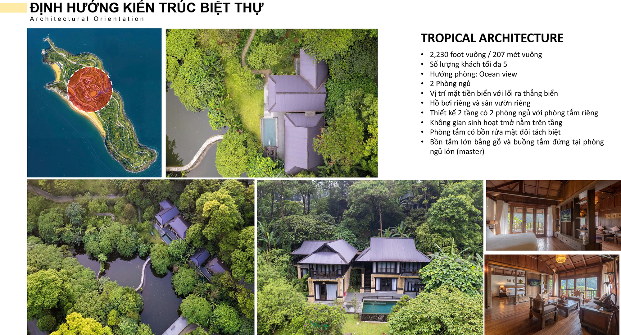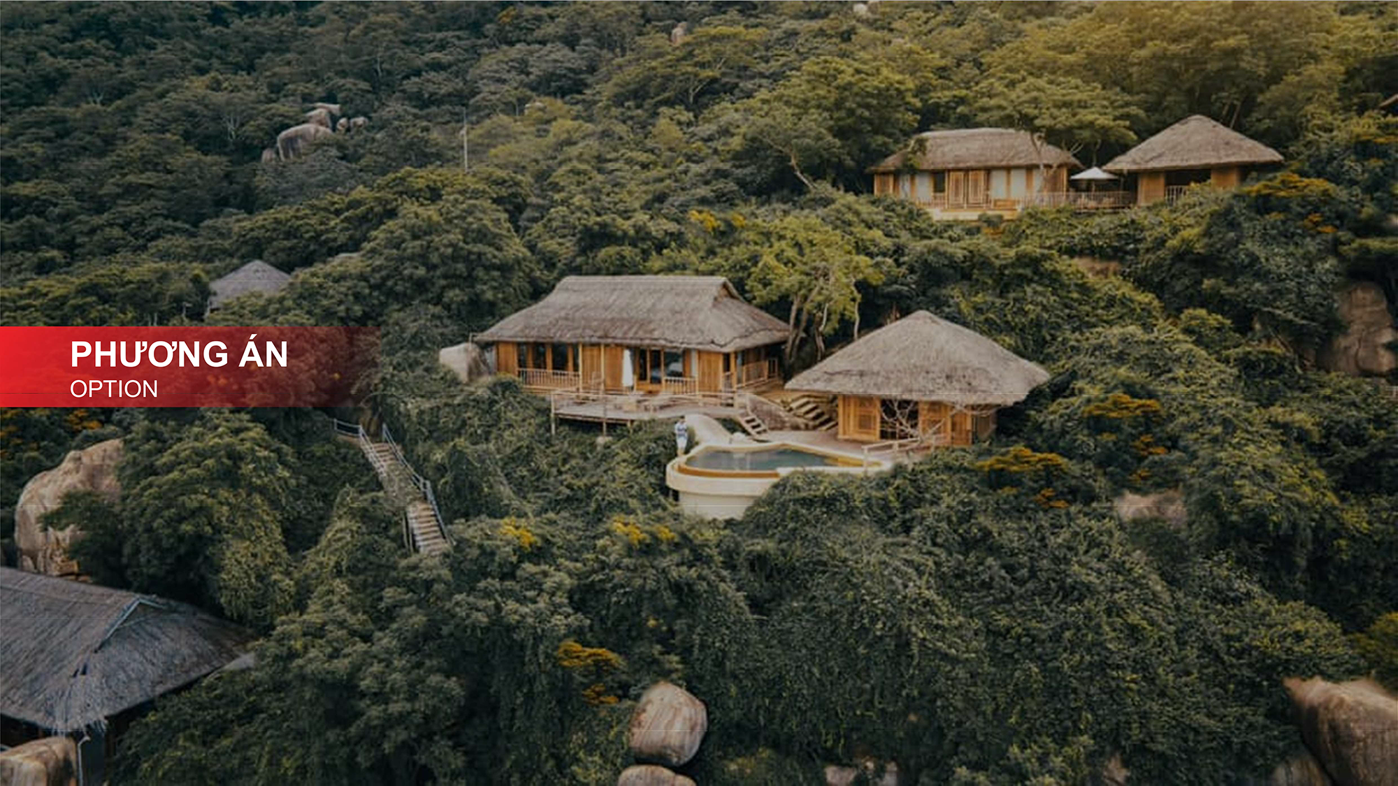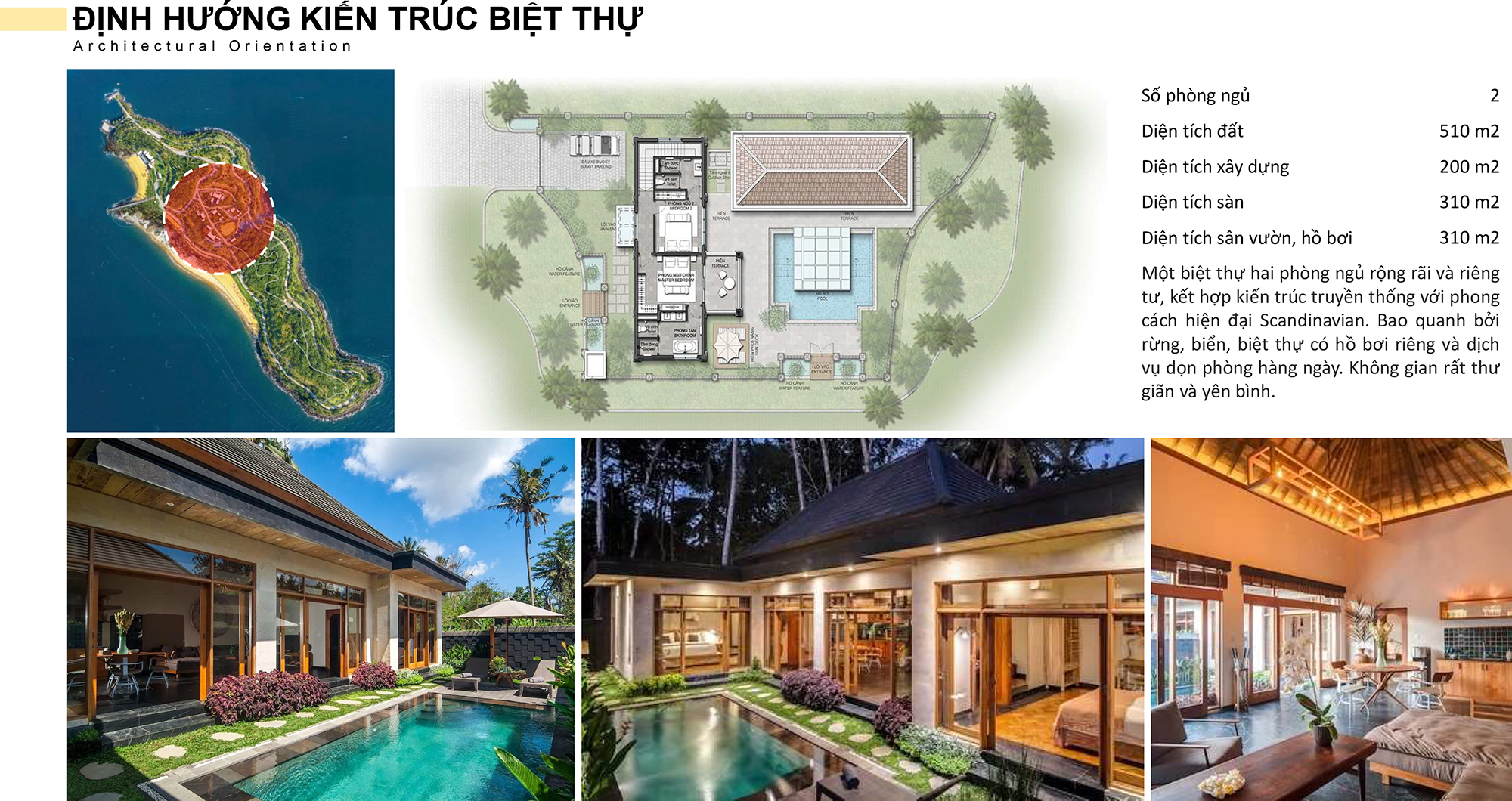Các bungalow và villa nghỉ dưỡng được bố trí giãn cách, nép mình theo triền dốc tự nhiên, tận dụng gió biển và ánh sáng trời thay vì can thiệp mạnh vào địa hình. Vật liệu ưu tiên gỗ, đá tự nhiên, mái lá hoặc vật liệu thân thiện môi trường nhằm giảm tác động sinh thái và tạo cảm giác mộc mạc, gần gũi. Mỗi căn đều có hiên rộng, khoảng sân mở hoặc không gian ngồi ngoài trời – nơi du khách có thể đọc sách, uống trà, nghe tiếng sóng và cảm nhận nhịp sống chậm rãi của biển đảo.