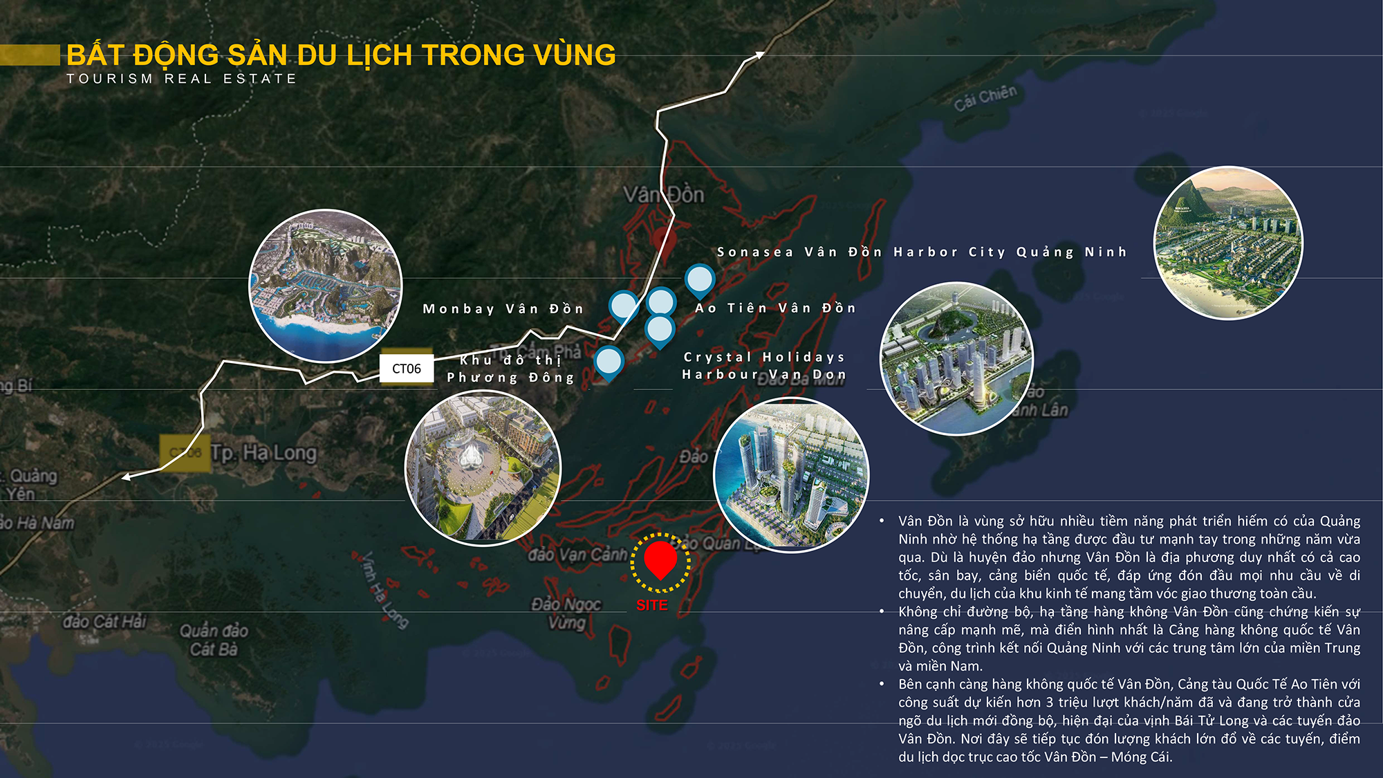 Với lợi thế hạ tầng giao thông ngày càng hoàn thiện, đặc biệt là sự hiện diện của Sân bay Quốc tế Vân Đồn, Vân Đồn đang trở thành điểm đến chiến lược cho du lịch biển phía Bắc. Sự kết hợp giữa cảnh quan tự nhiên, quy hoạch bài bản và định hướng phát triển bền vững giúp khu vực này thu hút nhiều dự án nghỉ dưỡng cao cấp. Trong tương lai, Vân Đồn không chỉ là điểm đến du lịch biển lý tưởng mà còn hứa hẹn trở thành trung tâm nghỉ dưỡng – giải trí đẳng cấp quốc tế.