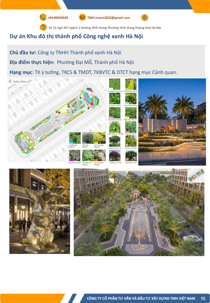 Đối với các khu đô thị và khu dân cư, TMH Việt Nam cung cấp dịch vụ trọn gói từ thiết kế ý tưởng, thiết kế cơ sở, lập tổng mức đầu tư đến triển khai bản vẽ thi công và dự toán hạng mục cảnh quan. Các dự án tiêu biểu trải dài từ Hà Nội, Quảng Ninh, Bắc Ninh đến Sơn La cho thấy năng lực triển khai đa dạng quy mô và địa hình. TMH chú trọng tổ chức không gian cây xanh theo hệ thống, tạo các trục cảnh quan trung tâm, công viên nội khu, sân chơi và không gian sinh hoạt cộng đồng nhằm nâng cao chất lượng sống cư dân. Giải pháp thiết kế đảm bảo đồng bộ hạ tầng kỹ thuật, tiết kiệm chi phí vận hành và phù hợp định hướng phát triển bền vững của đô thị hiện đại.