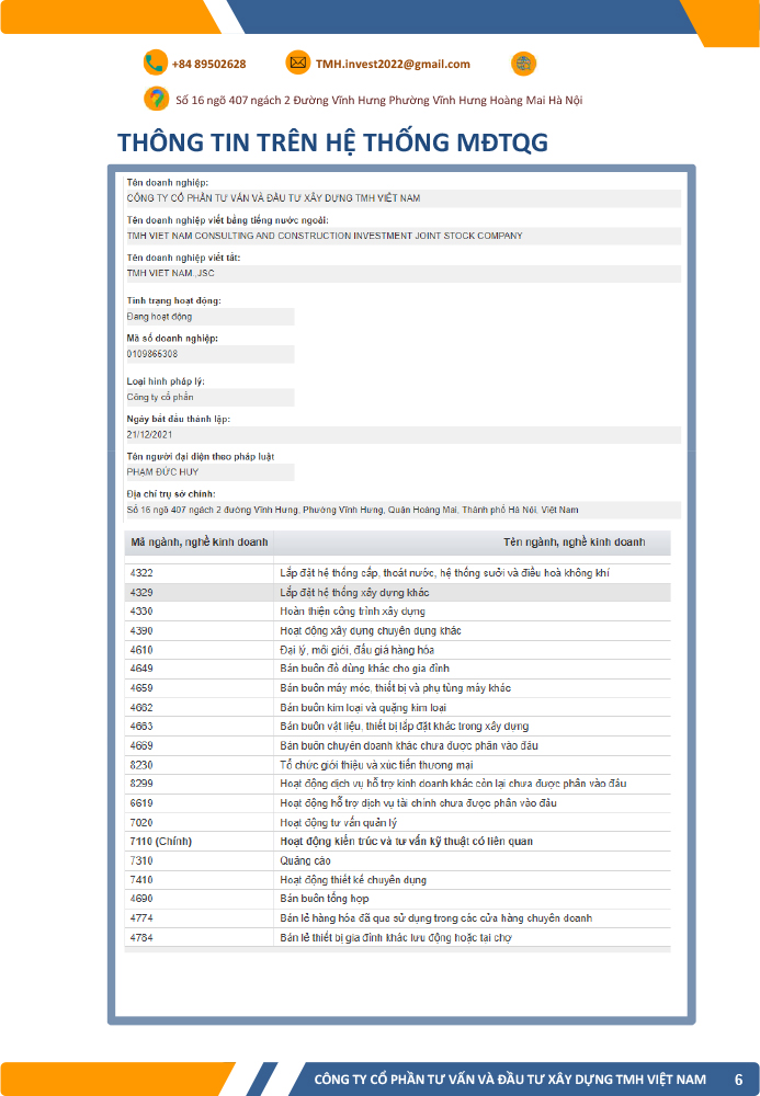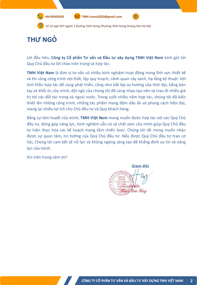 Với nền tảng kinh nghiệm, đội ngũ chuyên môn cao và hệ giá trị vững chắc, Công ty Cổ phần Tư vấn và Đầu tư Xây dựng TMH Việt Nam mong muốn trở thành đối tác chiến lược tin cậy của Quý Chủ đầu tư trong các dự án quy hoạch, kiến trúc, hạ tầng và phát triển đô thị.