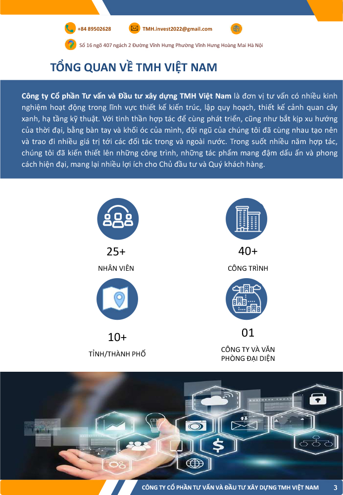 Công ty Cổ phần Tư vấn và Đầu tư xây dựng TMH Việt Nam là đơn vị hoạt động chuyên sâu trong lĩnh vực tư vấn đầu tư và xây dựng, với nhiều năm kinh nghiệm trong thiết kế kiến trúc, quy hoạch, cảnh quan cây xanh và hạ tầng kỹ thuật. Ngay từ những ngày đầu thành lập (2014), TMH Việt Nam đã định hướng phát triển theo mô hình doanh nghiệp chuyên nghiệp, lấy chất lượng dịch vụ và uy tín làm nền tảng. Trụ sở chính đặt tại số 16 ngõ 407 ngách 2 đường Vĩnh Hưng, phường Vĩnh Hưng, quận Hoàng Mai, Hà Nội, cùng hệ thống văn phòng đại diện phục vụ khách hàng trên nhiều tỉnh thành.