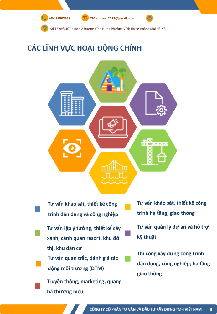 Với nền tảng chuyên môn vững chắc cùng đội ngũ kỹ sư, kiến trúc sư và chuyên gia giàu kinh nghiệm, TMH Việt Nam hoạt động đa dạng trong lĩnh vực tư vấn và đầu tư xây dựng, cung cấp giải pháp tổng thể từ ý tưởng đến triển khai thực tế. Các lĩnh vực hoạt động chính của công ty bao gồm: tư vấn khảo sát và thiết kế công trình dân dụng, công nghiệp; tư vấn lập quy hoạch, thiết kế kiến trúc, cảnh quan cây xanh cho khu đô thị, resort, khu dân cư; tư vấn thiết kế hạ tầng kỹ thuật và giao thông; tư vấn quản lý dự án và hỗ trợ kỹ thuật trong suốt quá trình triển khai. Bên cạnh đó, TMH Việt Nam còn thực hiện tư vấn quan trắc, đánh giá tác động môi trường (ĐTM), thi công xây dựng các công trình dân dụng – công nghiệp – hạ tầng giao thông, đồng thời cung cấp dịch vụ truyền thông, marketing và quảng bá thương hiệu dự án. Với năng lực triển khai đồng bộ và quy trình làm việc chuyên nghiệp, TMH Việt Nam cam kết mang đến những giải pháp tối ưu, hiệu quả và bền vững cho mọi công trình.